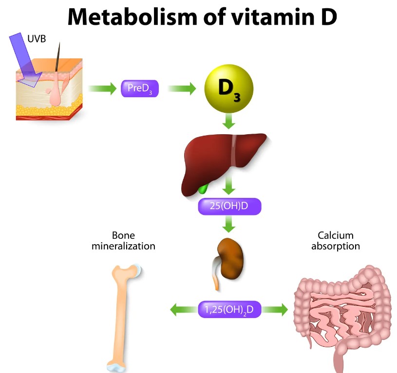 Η βιταμίνη D είναι ένα σημαντικό θρεπτικό στοιχείο που παίζει κρίσιμο ρόλο στην υγεία του ανθρώπινου οργανισμού. Ο μεταβολισμός της βιταμίνης D συμβαίνει σε διάφορα στάδια και περιλαμβάνει τη σύνθεση, τη μετατροπή, και τη χρήση της σε διάφορα κύτταρα και ιστούς του σώματος.